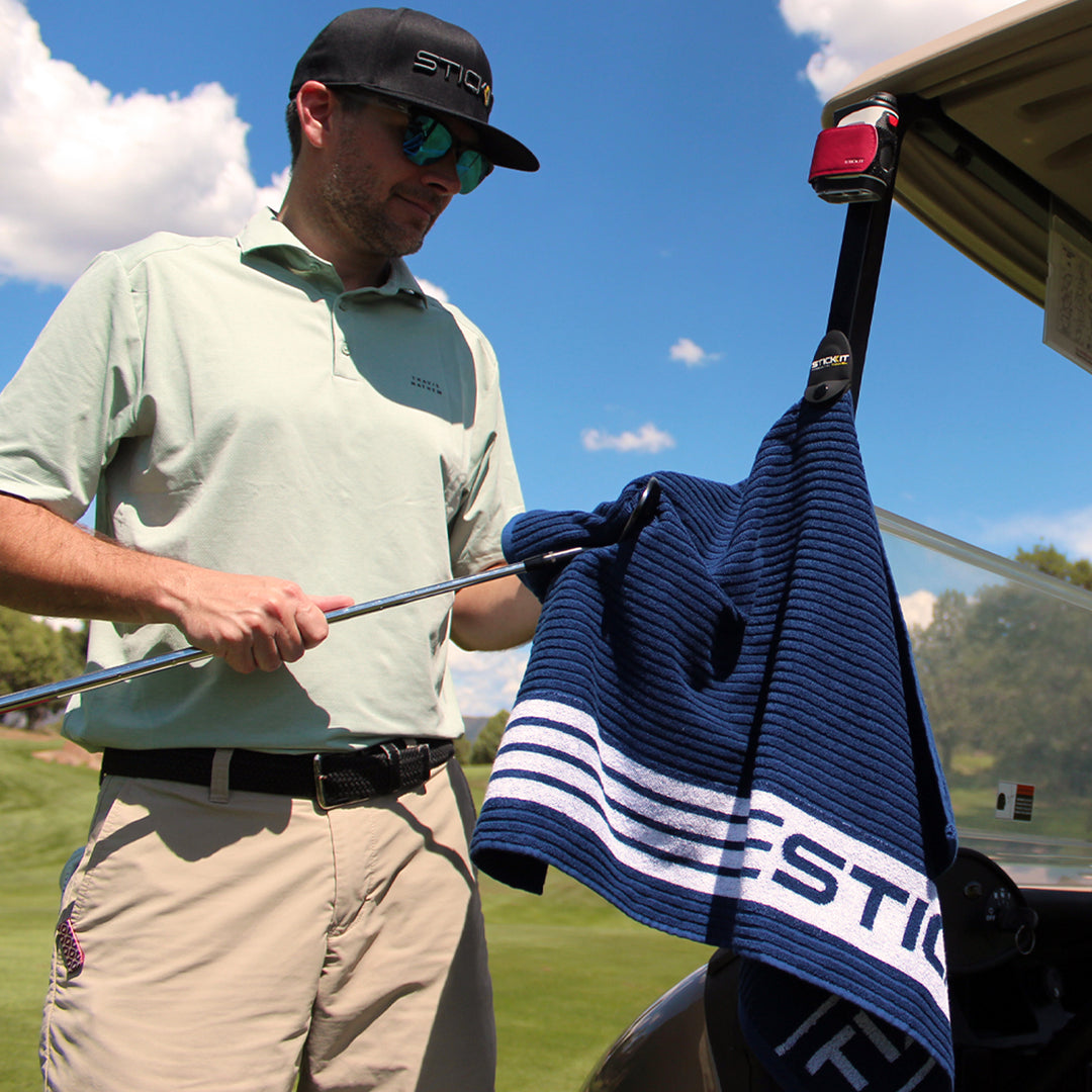 This large 35" x 20”, cotton terry-weave towel golf towel features a removable industrial-strength magnet that snaps and holds to carts, metals, hybrids, irons, wedges, putters, and bags for grab-and-go access from tee to green.